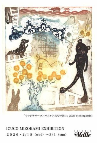 溝 上 幾 子 個展~羽があったり、なかったり~ 今回は、銅版画とタブロー、ドローイングの新作を中心に展示します。 わたしの絵に現れるものたちには、羽があったり、なかったりします。 彼らは、羽があるからといって高く飛ぶこともないですが、 羽がないからといって、嘆いたりもしません。 わたしは眼を凝らして、日常の風景のなかに放たれる、 彼らのほんの少しの異彩も見逃さぬよう、描いていけたらと思っています。 2026年2月18日(水)~3月1日(日) 12:00~19:00 最終日17:00まで 月曜休廊